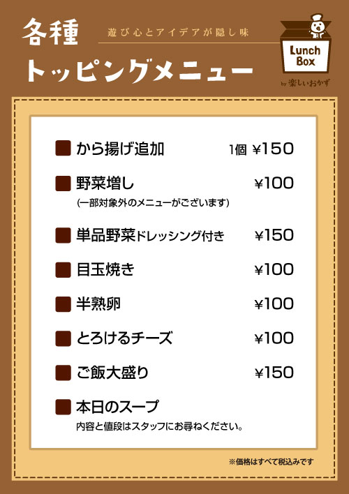 Information店舗情報 店舗名 LunchBox by 楽しいおかず 住所 〒212-0013 神奈川県川崎市幸区堀川町580−16 川崎テックセンター 2F アクセス 京急川崎駅から406m 電話番号 070-9305-9744 営業時間 11:00〜14:45 定休日 土曜日、日曜日、祝日